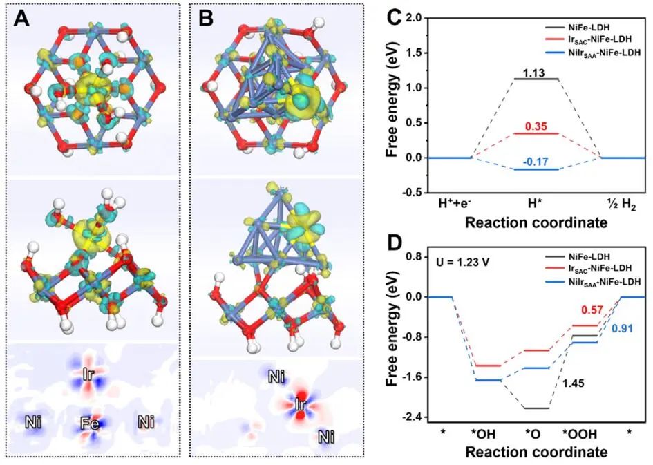电催化整体水分解是一种很有前途的制氢方法,在原子水平上合理设计催化剂对于降低析氢和析氧反应(HER/OER)中的能量势垒至关重要。基于此,北京化工大学宋宇飞教授等人报道了NiFe-LDH负载的NiIr单原子(NiIrSAA-NiFe-LDH)和NiFe-LDH负载的Ir单原子(IrSAC-NiFe-LDH)用于整体水分解。在电流密度为10 mA cm-2时,所制备的NiIrSAA-NiFe-LDH在HER和OER中过电位分别为28.5 mV和194 mV。此外,由NiIrSAA-NiFe-LDH和IrSAC-NiFe-LDH组装的电解槽在10 mA cm-2下具有1.49 V的低电池电压,在200 mA cm-2下整体水分解具有超过120 h的长期稳定性,估计每千克H2的成本为1.12美元。通过DFT计算发现,对于NiIrSAA-NiFe-LDH,元素Ir表现出局部电子积累(-0.15 e),元素Ni表现出局部电子耗尽(0.15 e),表明NiIrSAA中的电子从Ni转移到Ir,而IrSAC-NiFe-LDH的Ir(1.34 e)和Ir相邻的Ni(0.89 e)都失去了电子,并且电子倾向于在O原子周围积聚,表明电子从Ir和Ir相邻的Ni转移到氧。从HER中的Tafel斜率可以看出,2H*→2* + H2是决定速率的步骤,作者计算了H吸附的自由能(ΔGH*)。对于NiIrSAA-NiFe-LDH,计算出Ir上的H*吸附ΔG值为-1.52 eV,高于Ni上的H*吸附ΔG值(-0.17 eV)。因此,NiIrSAA的Ni位点被认为是HER中的活性位点。此外,作者计算出IrSAC-NiFeLDH最可能的吸附位点为Ir附近的Ni位点,吸附能最低为-1.367 eV,NiIrSAA-NiFe-LDH的最佳吸附位点为Ir附近的NiIrSAA的Ni位点。对于IrSAC-NiFe-LDH和NiIrSAA-NiFe-LDH,OER过程倾向于在Ni位点进行,其中*OH中间体首先被吸附,然后依次演化为*O、*OOH和O2。