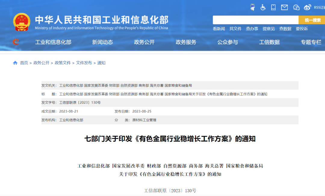 8月21日,工业和信息化部、国家发展改革委、财政部、自然资源部、商务部、海关总署、国家粮食和储备局等七部门联合印发《有色金属行业稳增长工作方案》。《工作方案》提出,有色金属行业涉及品种多、应用广、战略价值突出,是发展战略性新兴产业和国防科技工业的重要支撑,是维护国家资源安全和产业安全的重要领域。为深入贯彻党的二十大和中央经济工作会议精神,把稳增长摆在首要位置,推动有色金属行业质的有效提升和量的合理增长,实现发展预期目标,特制定本方案,实施期限为2023—2024年。