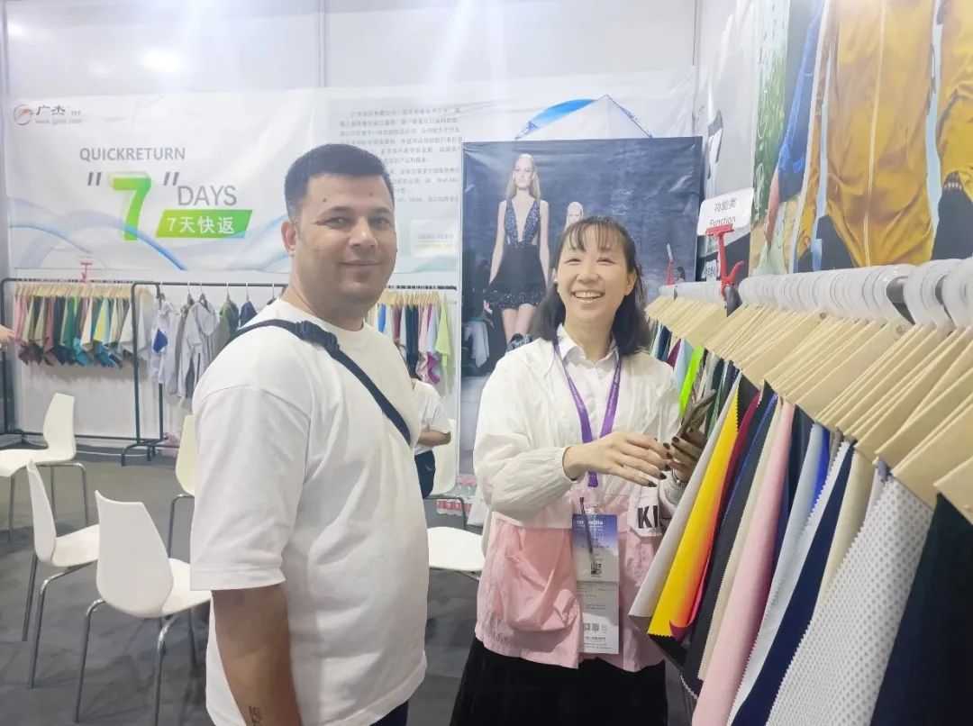 广杰纺织在本次面料展上,主打功能、户外运动系列产品,在以往棉羽风衣类服饰的基础上,通过调整纱线的功能,增加某些特殊后整,使得产品更加的多元化,受到了众多客商青睐。参展的主要产品有永久防晒、吸湿速干类的皮肤衣、弹力面料,更具蓬松度和弹力索罗那纱线产品,具有超高透湿透气且手感俱佳的复合类产品,充分切合参展主题,展位前来往人员络绎不绝,观看、咨询、交流异常火爆。