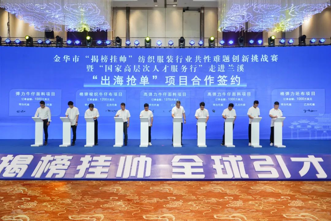 启动仪式现场举行了项目签约(揭牌)仪式,浙江省纺织品进出口集团有限公司与兰溪市政府签订战略合作协议、中国棉纺织产业人才联合培养基地揭牌成立、纺织服装行业5项“出海抢单”项目合作签约、纺织服装行业5项“揭榜挂帅”项目合作签约。启动仪式后,金华市“揭榜挂帅”纺织服装行业共性难题创新挑战赛、国家高层次人才服务行——走进兰溪活动举行。