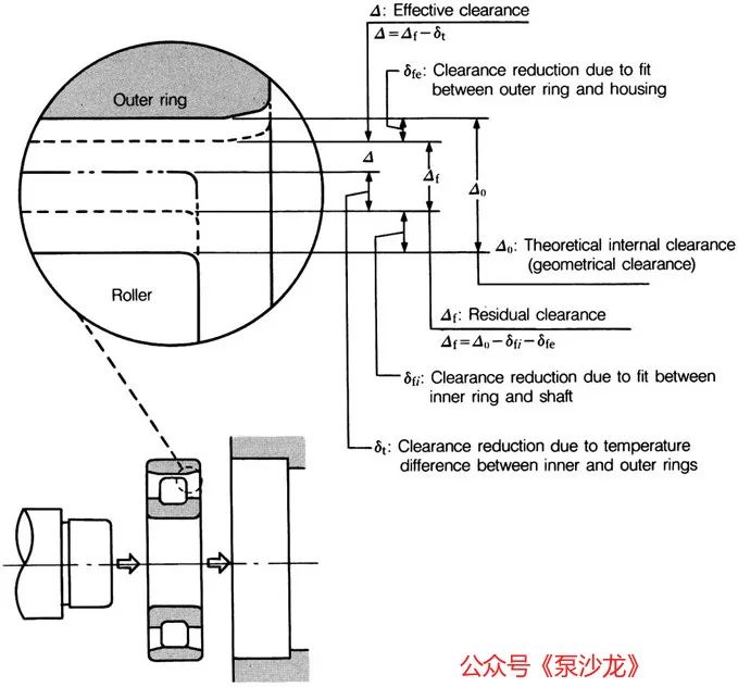 当轴承内圈压配合到轴上时,或当外圈压配合到壳体中时,由于轴承滚道的膨胀或收缩,径向内部间隙自然会减小。一般来说,大多数泵都有一个旋转轴,要求内圈和轴之间紧密配合,外圈和外壳之间松散配合。在这些情况下,只需要考虑过盈配合对内圈的影响。