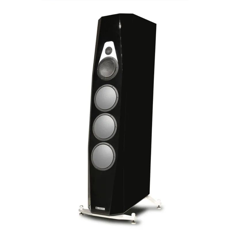 眼前这对Vimberg Tonda座地式音箱有着豪华感突出、亮光闪闪的黑色钢琴漆饰面,配合前面板上单元盆架的金属色,形成了优雅而稳重的“黑白灰”搭配,非常耐看。箱体外形相当别致,从侧面看呈一个向后倾斜的菱形,前面板的边角被切为斜角的平面,正面看上去呈一种漂亮的“钻石”形。这样的箱体设计有效减少了箱体内部的平行表面,也可以有效降低箱内低频驻波的产生,不会对声音表现造成干扰。而这样向后倾斜的前面板设计,使得面板上安装的单元的发音中心位于一条垂直线之上,保证高中低频声音相位的一致性,有助于提升音场表现。