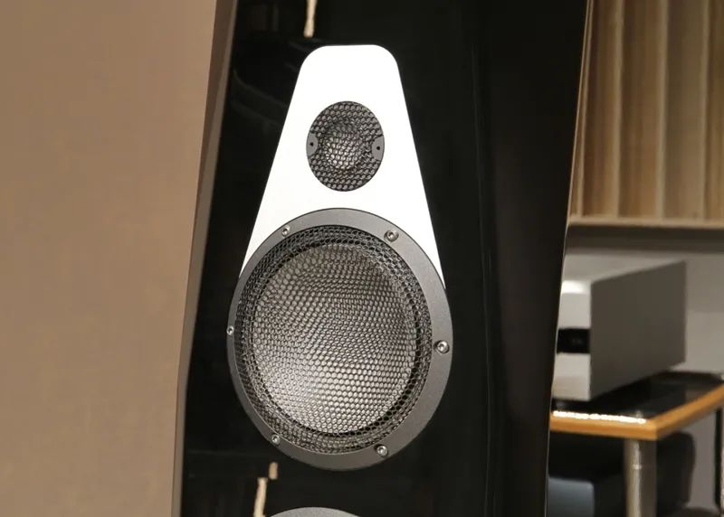 Vimberg Tonda座地式音箱采用3音路5单元低音反射式设计,全数单元皆采用Accuton的制品。在前面板上由上至下安装了一只高音单元、一只中音单元和三只低音单元,Accuton自创始以来就是以生产陶瓷和钻石振膜单元闻名,这一次也不例外。高音方面,现场的Tonda座地式音箱采用直径30mm的陶瓷振膜材料,可以在高频段实现罕见的声音透明度和开阔感。Tonda的中音单元振膜直径为168mm,振膜为内凹的陶瓷材料,不仅轻盈,也非常坚固,因此谐振极低,瞬态反应速度也非常快,与高音单元和低音单元实现了良好的匹配和融合。两者的低音单元振膜外观看上去非同寻常,感觉有点像是被动低频辐射器,但其实它们是货真价实的完全单元,只不过铝合金材料的振膜较为突出,与盆架基本持平而已。低音单元直径为190mm,采用的铝合金振膜为三明治结构,表面呈3D成型的蜂窝状,侧面看上去有着漂亮的纹理。值得一提的是,如用家想解锁更亮丽的高频表现,可以选配口径同样为30mm的钻石高音单元,为与该版本区分,钻石高音的版本称为Tonda D。
