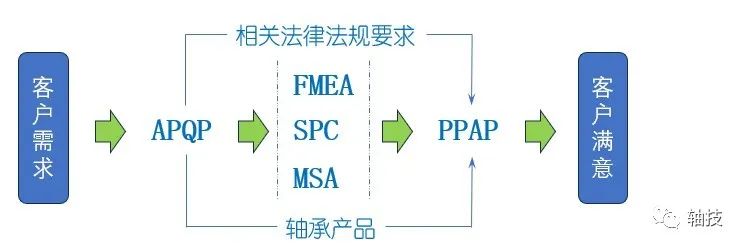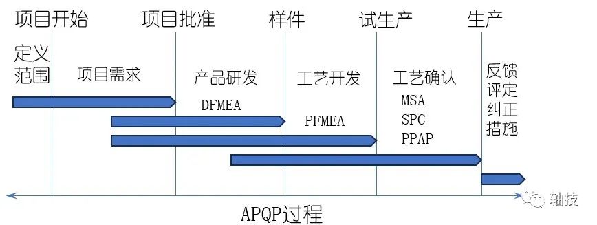 接下来进入样件试制阶段(Prototype),可能有人认为产品的试制已经进入生产阶段,应用工程师可以进入观望期,其实不然,要想产品真正能够满足设备的要求,需要将技术要求传递到生产端,涉及到生产工艺,品质管控,测量方法,装配工艺 ,包装等全流程参与。这对应用工程师的技能建立提出新的要求,同时需要对TS16949五大工具(SPC、MSA、FMEA、APQP、PPAP)有所了解掌握,彼此关系及APQP过程如下图: