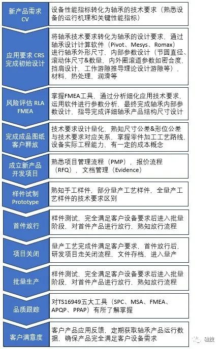 完成样件试制,进入到产品测试阶段,根据客户要求整理出产品测试要求(Test Spec.),轴承的测试分功能测试和寿命测试,不具备直接装机测试情况下,可能需要开发测试台架对轴承进行等效功能及寿命测试。结合测试结果及前期的轴承设计计算报告对轴承性能进行综合评估,给出产品是否满足客户要求结论或需要进一步改善建议,产品满足客户要求后,最终决定此次新产品研发项目圆满完成,进入批量生产阶段,应用工程师负责批量生产的首件放行和阶段性的品质跟踪。