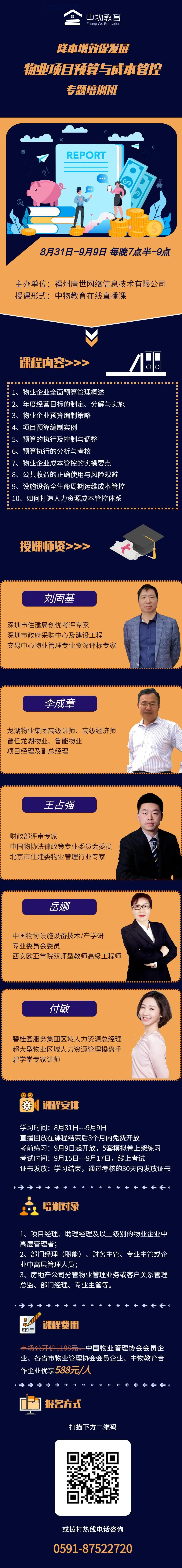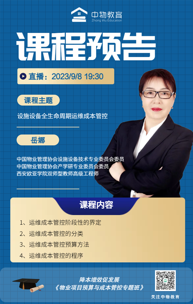 中物教育特邀行业权威专家,自8月31日起开设“物业项目预算与成本管控”专题培训班,为物业人系统性讲解经营目标的拟定、项目收入与成本测算、预算的编制、执行、调整和全过程控制,并深入剖析公共收益、设施设备、人力资源等关键模块的财务风险规避与成本管控问题。经由本期培训,物业企业及项目管理者能够更科学地围绕经营目标编制预算,带着财务思维重新认知日常管理与业务经营,运用行之有效的策略实现降本增效,使得企业及项目健康运转。欢迎广大物业同仁踊跃报名!