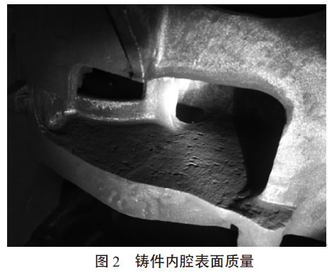 铸件浇注后按照工艺规定的时间进行开箱,开箱后震动落砂机进行清砂,内腔未掉落砂块使用机械工具进行辅助清理,清理后使用吊挂式抛丸机进行抛丸处理,观察铸件的内腔表面情况,各种试验方案的内腔表面质量如下图3~6 所示。