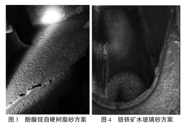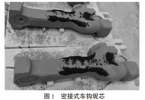 主要采用铬铁矿砂、碱酚醛树脂砂、酚脲烷自硬树脂砂、覆膜砂等不同型砂作为车钩内腔坭芯的成型材料,外模制作工艺不变,其余铸造工艺参数(浇冒口、冷铁、浇注温度等)保持不变,通过铸件浇注试验,查看铸件的表面质量情况。