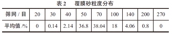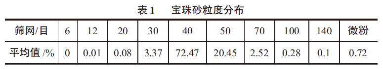 原砂采用宝珠砂,角形系数1.06,耐火度≥1800℃,密度(1.95~2.05)g/cm3,主要成分为Al2O3和SiO2,热膨胀率0.13%,原砂粒度40/50 目,宝珠砂的水分为0.16%。宝珠砂40、50 两筛集中度达到93%,粒度较为集中,具体数据见表1。粘结剂和固化剂采用笔者公司使用的改性水玻璃、有机酯。根据公司规定的配比进行型砂混制,具体如下:水玻璃占原砂重量的2.5%,有机酯占水玻璃重量的15%。
