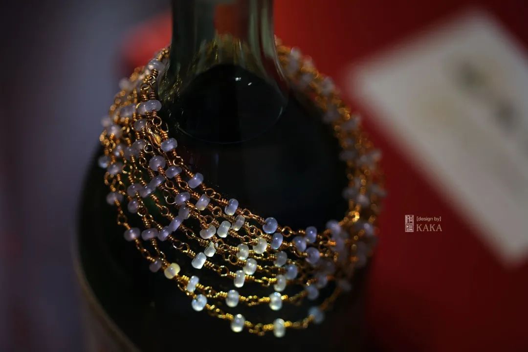 足足用了30多克的黄金,120多粒玻璃种翡翠算盘珠,超过1米4的长项链,可以任意绕脖子两圈,三圈,四圈,完全看搭配方式,像我这样不算瘦的人,四圈也一点都不累赘。