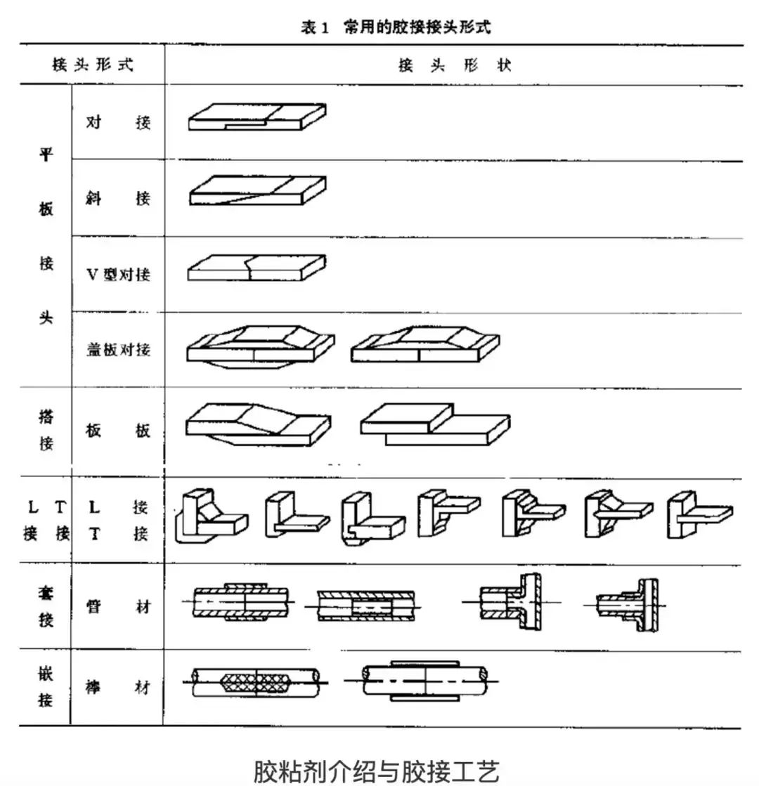 4)设计的胶接接头应便于加工,表1是几种常用的胶接接头形式。