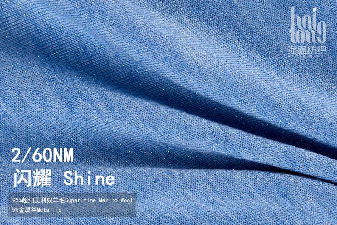 Shine 选用澳洲进口超细美利奴羊毛作为主材料,使织物有着良好的垂坠感和动感。其的纤维结构和微微的卷曲度使其制成的服饰具有很强的弹性,有极好的延展性。由于美利奴羊毛极为纤细,具有更好的柔顺度和柔肤性。色纺的工艺使得纱线颜色更加靓丽鲜艳,同时,我们还增加了无感闪光丝,在不影响触感的前提下,使其增加了时尚感。色纺显现出多种颜色,色差丰富、饱满柔和。色纺纱的先染后纺生产工艺,比传统工艺节水减排50%以上,符合低碳环保要求。