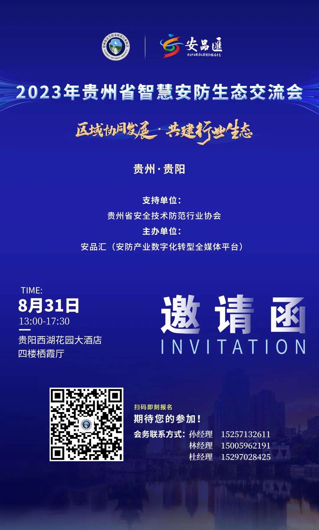 2023年贵州省智慧安防生态交流会将于8月31日在贵阳西湖花园大酒店四楼栖霞厅举办。