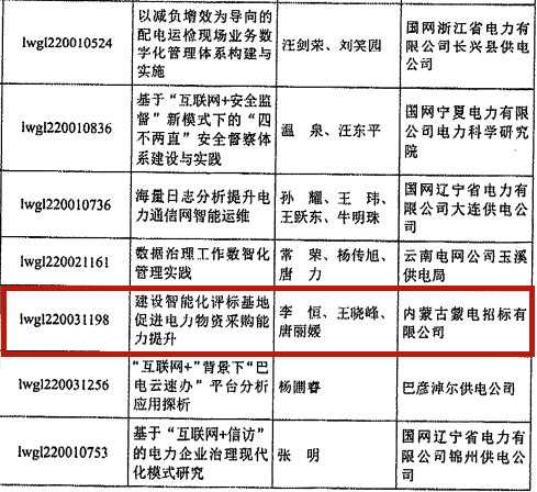 近期,2022年全国电力企业管理创新优秀实践论文征集结果正式揭晓,蒙电招标公司斩获佳绩,由公司李恒、王晓峰、唐丽媛撰写的论文《建设智能化评标基地促进电力物资采购能力提升》入选优秀实践论文。