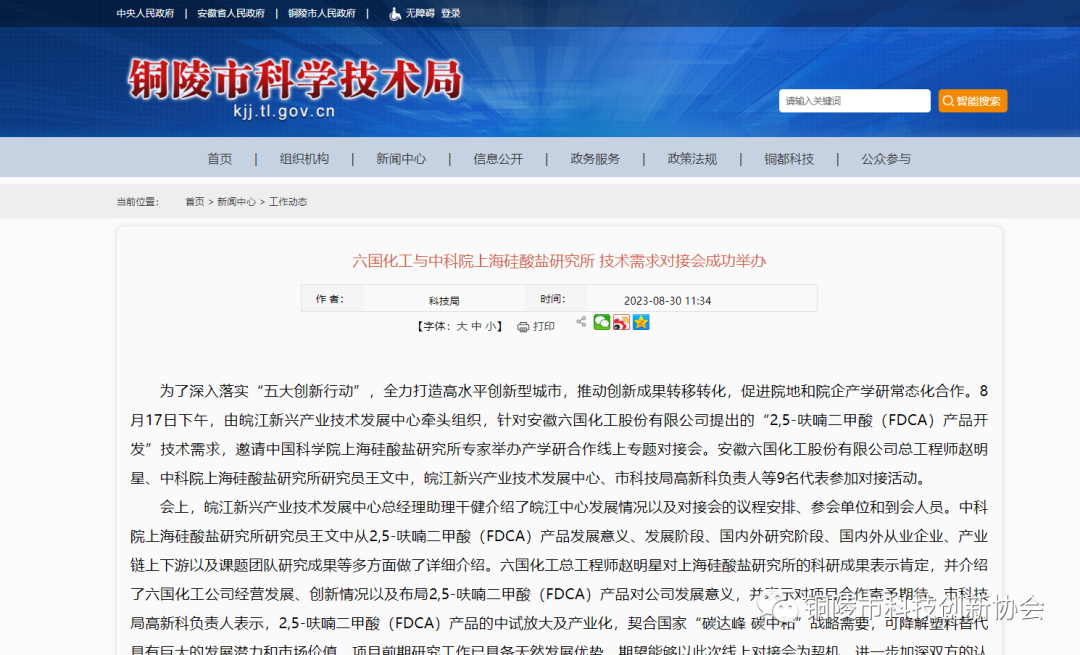 为了深入落实“五大创新行动”,全力打造高水平创新型城市,推动创新成果转移转化,促进院地和院企产学研常态化合作。8月17日下午,由皖江新兴产业技术发展中心牵头组织,针对安徽六国化工股份有限公司提出的“2,5-呋喃二甲酸(FDCA)产品开发”技术需求,邀请中国科学院上海硅酸盐研究所专家举办产学研合作线上专题对接会。安徽六国化工股份有限公司总工程师赵明星、中科院上海硅酸盐研究所研究员王文中,皖江新兴产业技术发展中心、市科技局高新科负责人等9名代表参加对接活动。