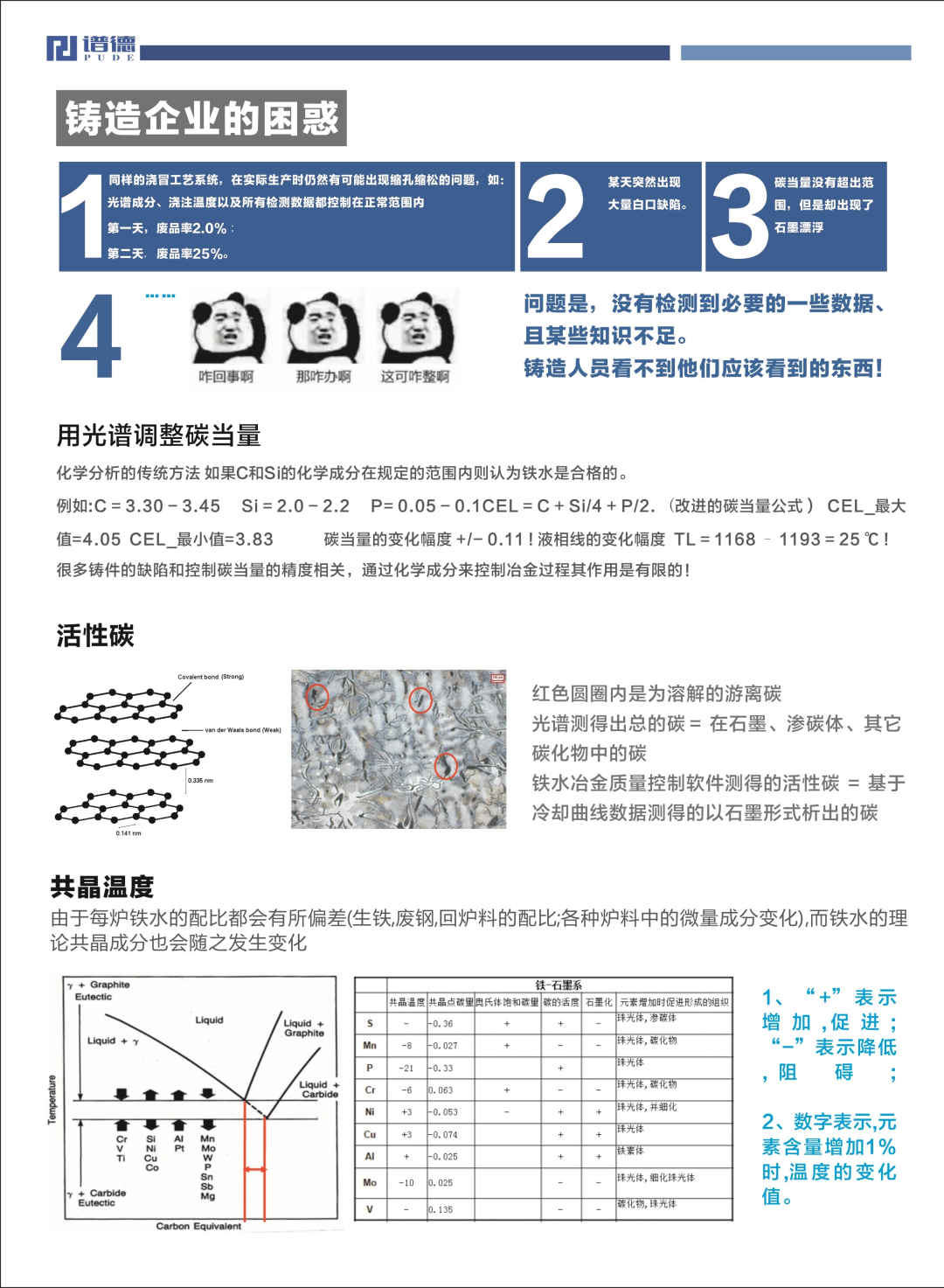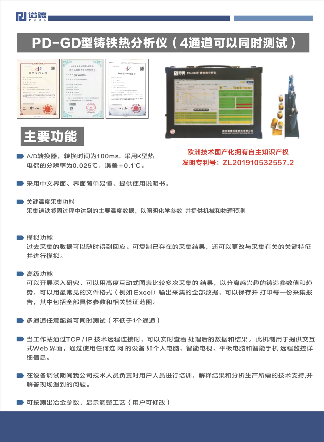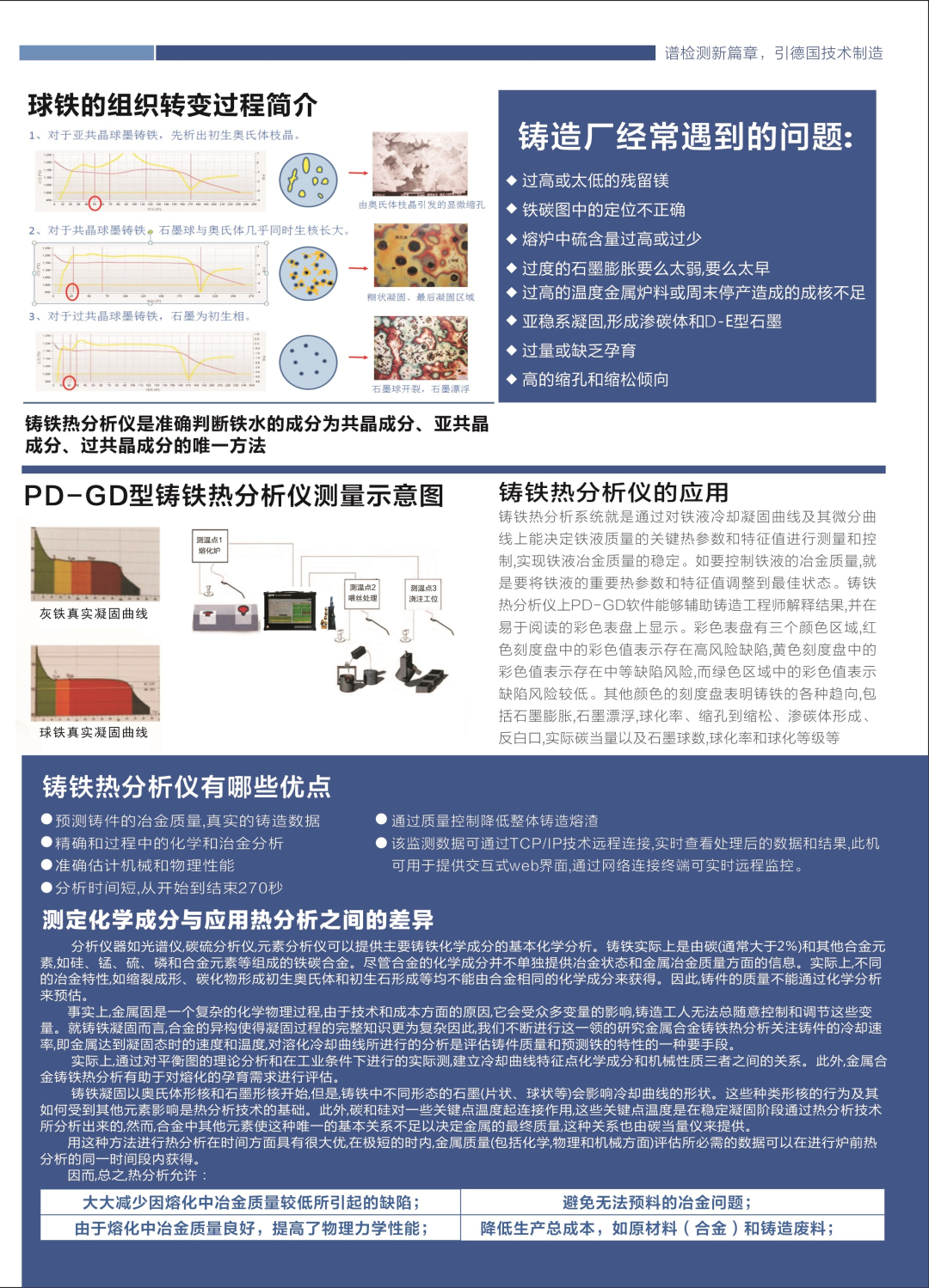 南京谱德仪器PD-GD型铸铁热分析仪,能准确确定铁水为:亚共晶,共晶,过共晶,活性成分,初生奥氏体,初生石墨,再辉度,氧化因素,二次石墨析出量,热导率,渗碳体(白口),缩孔缩松,反白口及冶金质量综合评分等决定铸件质量的冶金参数,能使铁水真实凝固的整个过程直观,可视化,数据化,包括对孕育效果评估(缺乏和过孕育),南京谱德技术服务人员在安装调试期间,解释铁水整个凝固过程和针对出现的问题,提供解决方向。