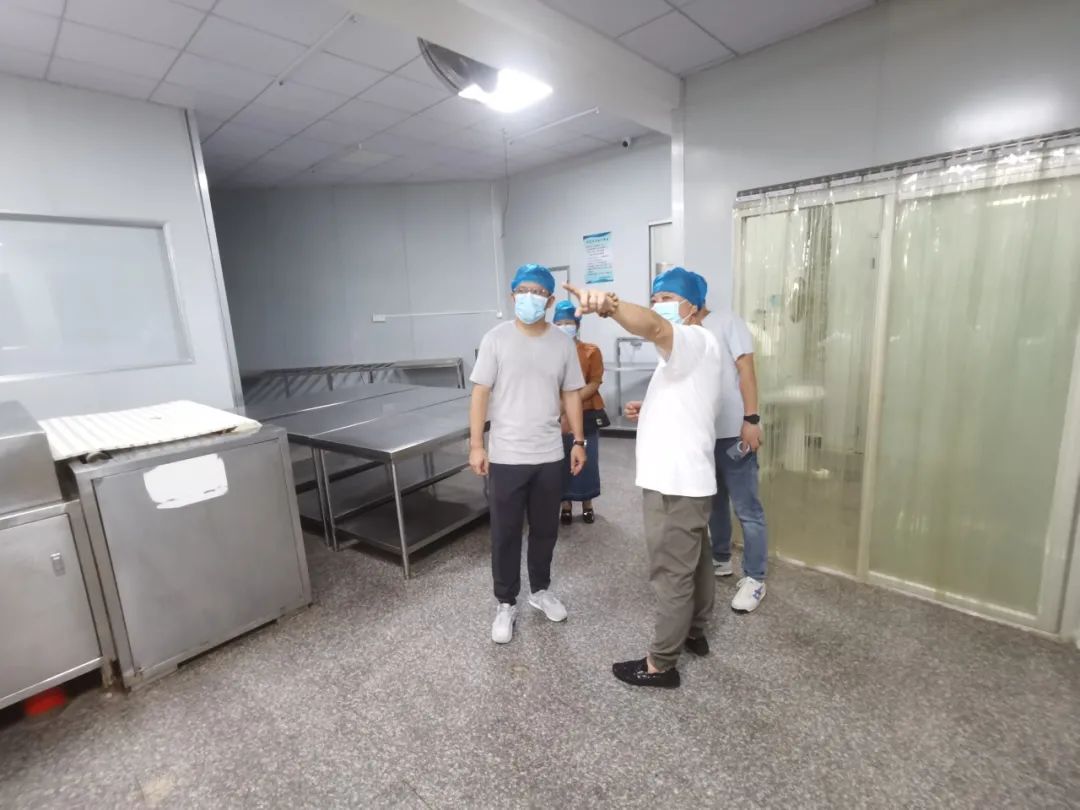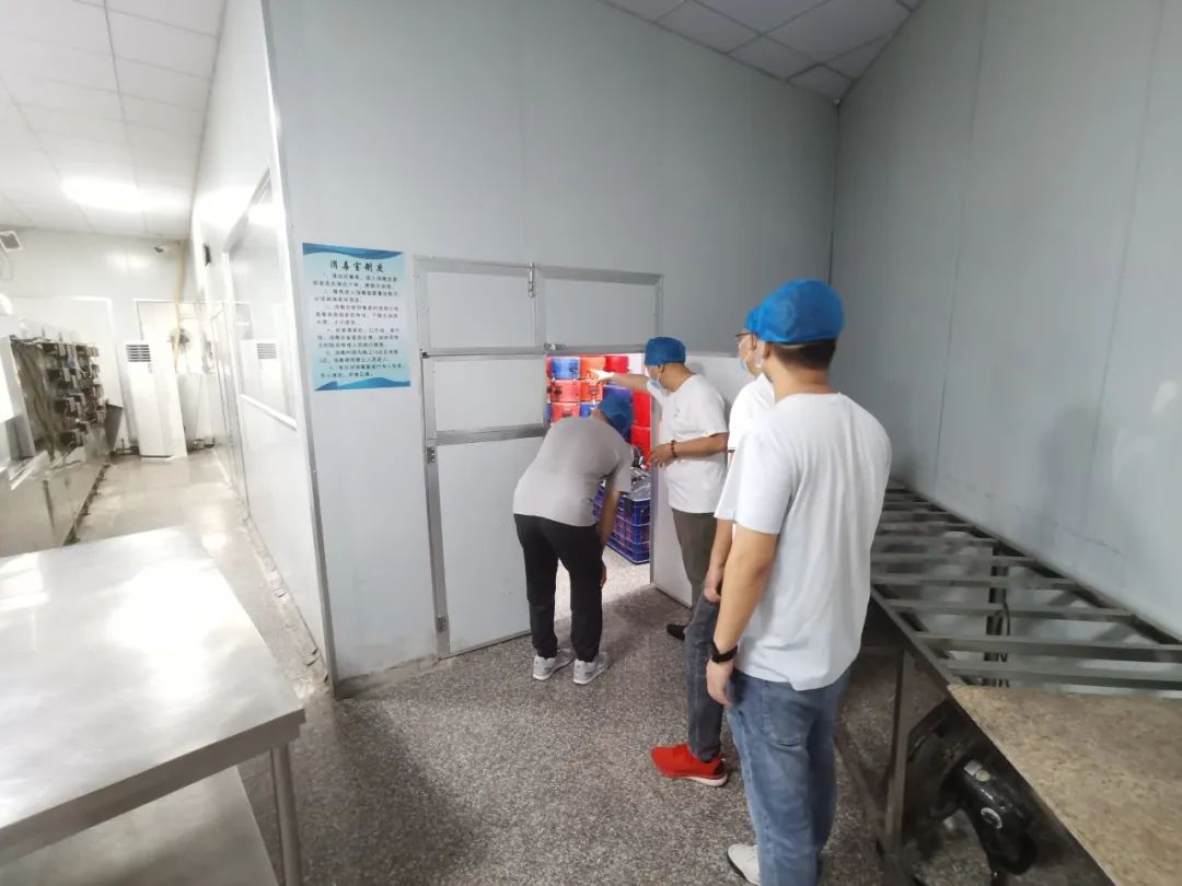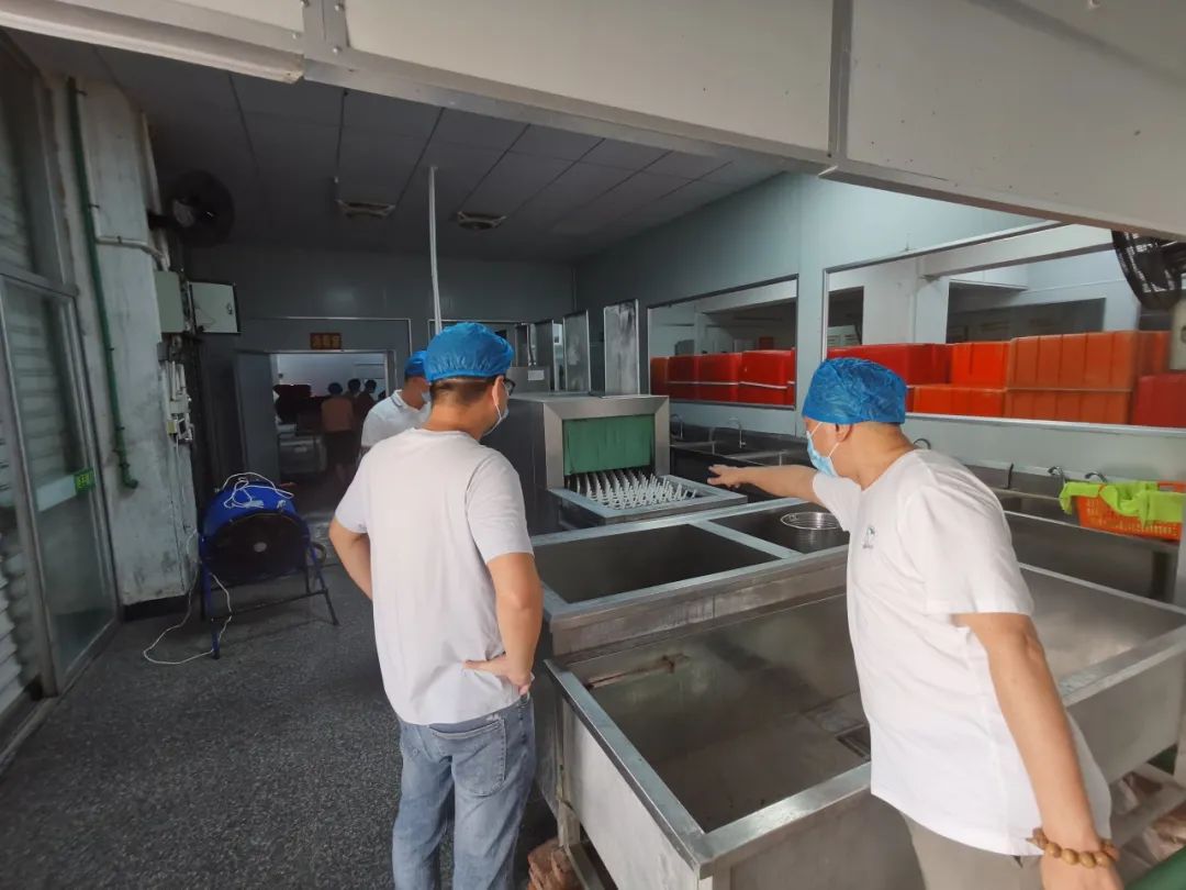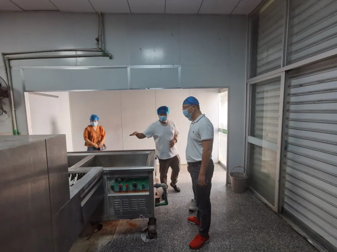 在配餐公司负责人的陪同下,我校检查小组成员检查了配餐公司内部及周边环境,提出了学校中午配餐是开学的一个重点工作,是食品安全、健康防控的关键环节。黄校长详细了解学校食堂原材料加工流程、备餐、餐具清洗消毒保洁、明厨亮灶、餐厨废弃物等各环节工作。他强调要高度重视配餐公司餐饮安全工作,强化食品进货查验、对餐具的卫生把控、加工操作等全过程监管,严把服务人员健康关、食材进货关、加工制作关。