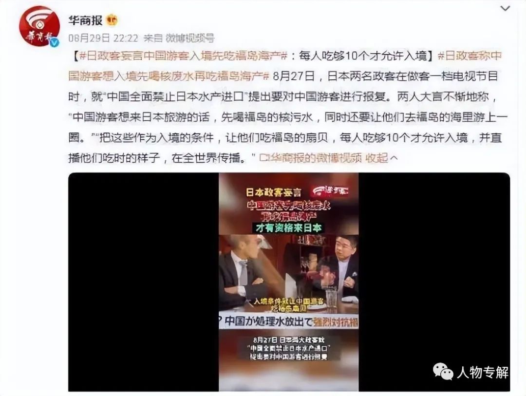 日本政客更加嚣张,居然在节目中公开嘲笑。中国游客到日本去旅游时,先喝日本福岛核废水。去日本福岛去游泳,再去吃10个核废水的扇贝。这让全世界的人怎么想?