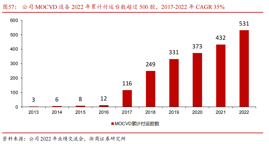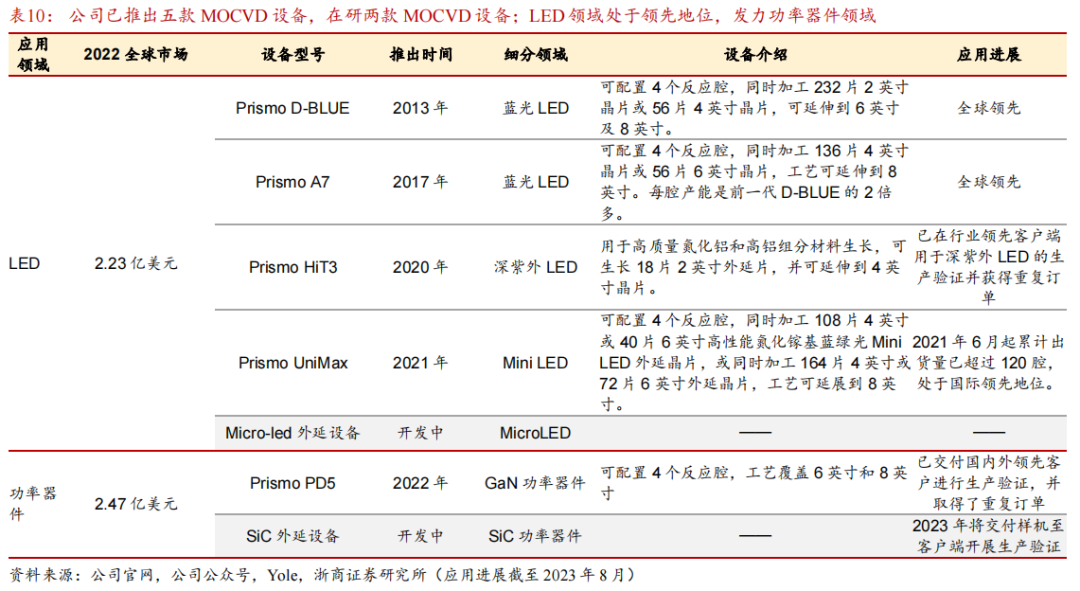 立足优势蓝光LED领域,发力高端LED、功率器件市场。自2013年公司推出第一款应用于蓝光LED的MOCVD 设备以来,于2017、2020、2021年、2022年持续推出应用于蓝光LED、深紫外LED、Mini LED和GaN 功率器件的MOCVD设备。公司蓝光LED MOCVD设备处于全球领先地位,同时积极研发Micro LED、SiC功率器件MOCVD设备,持续拓展新业务增长极。公司紧跟市场发展趋势,针对Micro-LED应用的专用MOCVD设备正开发中。随着电动汽车、光伏储能、轨道交通等应用的快速发展,市场对碳化硅功率器件的需求呈现爆发式增长,公司应用于碳化硅功率器件外延生产设备2023年将交付样机至客户端开展生产验证,进一步丰富公司的产品线。