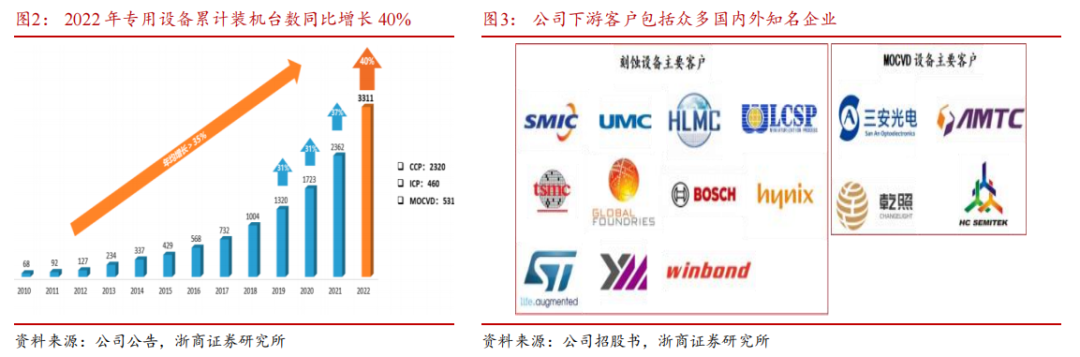 中国半导体刻蚀、MOCVD设备龙头,设备类型不断拓展。公司于2004年成立,从刻蚀设备起步,逐步拓展至MOCVD、VOC、LPCVD等设备,下游包括集成电路、LED 外延片、先进封装、MEMS 等半导体产品制造公司,客户遍布中国大陆和台湾、新加坡、韩国、德国、意大利、俄罗斯等国家和地区,是一家以中国为基地、面向全球的微观加工高端设备公司。公司目前主要营收来源为刻蚀和MOCVD设备,发力LPCVD、ALD、Epi等半导体设备。 公司的等离子体刻蚀设备已被广泛应用于国内外一线客户从 65 nm到 14nm、7nm和 5nm及其他先进的集成电路加工制造生产线及先进封装生产线上。截至2022年底,公司共有3311多个反应台在86家客户的106条生产线上实现全面量产。