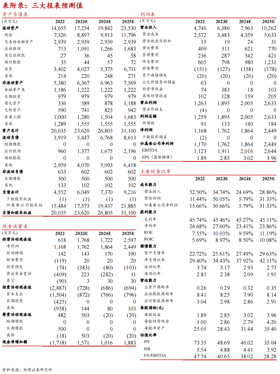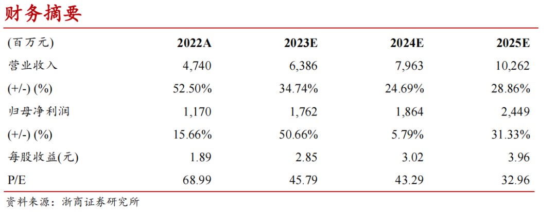 盈利预测与估值 我们预计2023-2025年公司营业收入分别为63.86、79.63、102.62亿元,同比增长34.7%、24.7%、28.9%;归母净利润分别为17.62 、18.64 、24.49亿元,同比增长50.7%、5.79%、31.3%;对应PE 分别为46、43、33倍,给予“买入”评级。