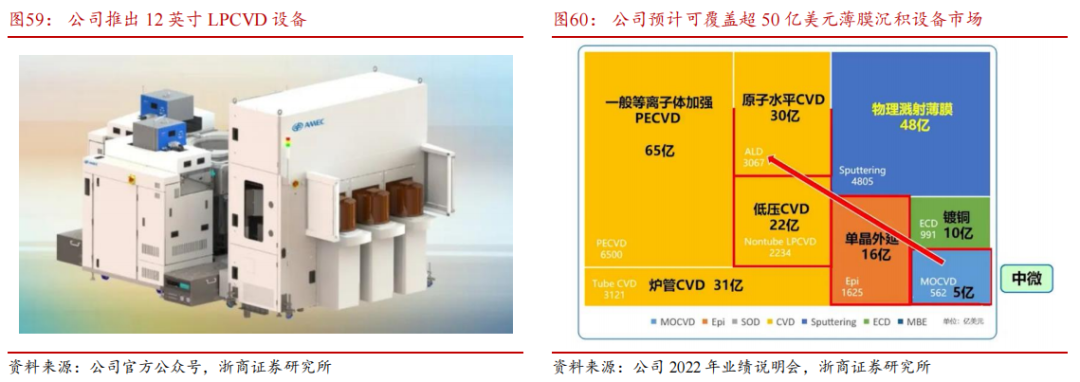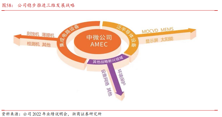3、立足优势蓝光LED领域,发力高端LED、功率器件市场。 MOCVD常用于制造LED、激光器、功率器件、射频器件等,其中LED为第一大应用。Mini/Micro LED产业化与功率器件市场的发展带动MOCVD设备需求提升。公司氮化镓基LED设备处于全球龙头地位。2021年针对Mini LED市场推出量产MOCVD设备, 截至2022年底累计出货量已超120腔。在功率器件市场方面,公司已推出氮化镓功率器件MOCVD设备并获得先进客户重复订单,目前碳化硅、二代氮化硅功率器件的设备积极研发中。 4、内生外延协同发展,积极推进平台化布局。 公司持续稳步推进三维发展战略,在保持刻蚀设备和MOCVD设备竞争优势的同时,向半导体薄膜沉积、检测设备延伸,并积极扩展MEMS、功率器件、太阳能领域等泛半导体设备,探索环保及医疗健康设备等市场机会。内生方面,公司布局薄膜沉积设备领域,成功推出钨LPCVD、ALD设备并在客户端进行量产验证,积极推进ALD氮化钛设备和锗硅外延EPI设备研发。外延方面,公司积极进行投资与并购,投资睿励仪器(量测设备)和拓荆科技(薄膜沉积)等,通过外延式成长途径扩大产品和市场覆盖,平台化布局不断完善。