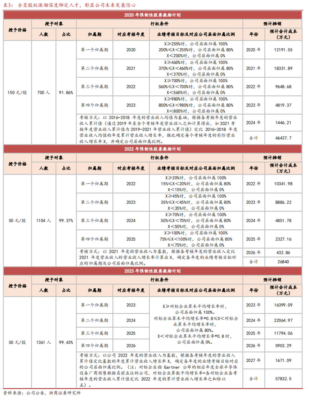 实行全员股权激励政策,深度绑定人才提高凝聚力。公司于2020年、2022年、2023年连续推出限制性股票激励计划。2023年3月30日,公司发布股票激励计划,拟向1390名激励对象授予50元/股的限制性股票,占公司员工总数的99.43%。全员持股有利于激发员工的主观能动性和创新创造力,进一步稳定和激励员工,为公司持续健康发展注入动力。