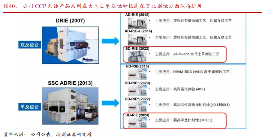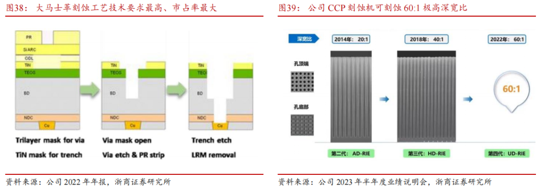公司打破海外垄断,CCP刻蚀设备不断升级。Primo AD-RIE、Primo HD-RIE等CCP刻蚀产品已广泛应用于国内外一线客户的集成电路加工制造生产线。在逻辑器件方面,公司的双反应台刻蚀机在国际最先进的 5 纳米及以下芯片生产线上实现了多次批量销售。在存储器件方面,公司的刻蚀设备不仅被广泛应用于 3D NAND 生产线,还成功通过了多个动态存储器的工艺验证并取得重复订单。逻辑器件领域,公司大马士革刻蚀工艺取得进展。在28nm及以下逻辑器件领域,作为市占率最大的刻蚀工艺之一,大马士革工艺对技术的要求极高,需一次性完成通孔和沟槽的刻蚀(All-in-one)。针对一体化大马士革工艺,公司推出了可调节电极间距的刻蚀机,反应腔的极板间距在刻蚀过程中可动态调节,从而同时满足对于通孔和沟槽刻蚀的不同工艺要求。存储器件领域,公司极高深比刻蚀机不断突破。在存储器件领域,极高深宽比刻蚀指在多种膜结构上刻蚀出深宽比极高(>40:1)的深槽,是最关键、最难突破的工艺。公司自主开发的极高深比刻蚀机用 400KHz 取代 2MHz作为偏压射频源,以获得更高的离子入射能量和准直性,使得深槽刻蚀关键尺寸的大小符合规格。2014年以来,公司的CCP刻蚀机所能刻蚀已从刻蚀20:1高深宽比发展进步至刻蚀60:1极高深宽比。
