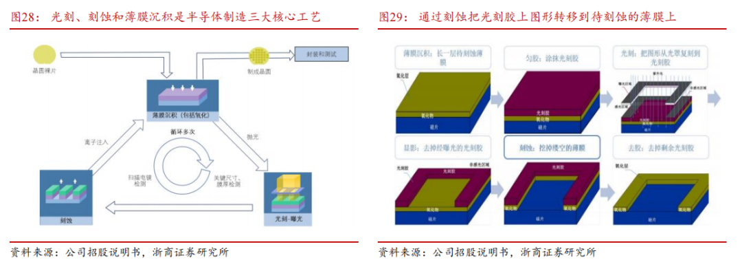 光刻、刻蚀和薄膜沉积是半导体制造三大核心工艺,刻蚀设备是半导体制造最重要的设备之一。集成电路制造工艺复杂,包括薄膜沉积、匀胶、光刻、显影、刻蚀等多种工艺,其中光刻、刻蚀和薄膜沉积是半导体制造的三大核心工艺。通过薄膜沉积工艺在晶圆上沉积一层待处理的薄膜用以后续加工,通过匀胶工艺把光刻胶涂抹在薄膜上,通过光刻和显影工艺把光罩上的图形转移到光刻胶,为刻蚀做准备,通过刻蚀工艺把光刻胶上图形转移到薄膜,去除光刻胶后,即完成图形从光罩到晶圆的转移。制造芯片所需要的数十层光罩主要通过薄膜沉积、光刻和刻蚀三大工艺循环,把所有光罩的图形逐层转移到晶圆上。