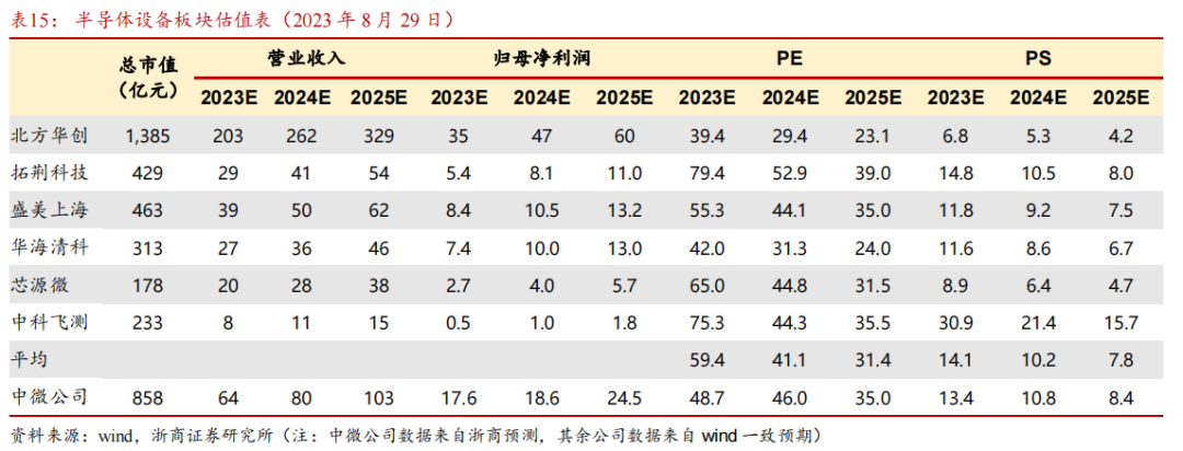 我们选取主营业务主要集中在前道半导体设备的北方华创、拓荆科技、盛美上海、华海清科、芯源微、中科飞测代表半导体设备板块。2023年8月29日,板块2023-2025年PE分别为59.4 、41.1、31.4倍,PS分别为14.1、10.2、7.8倍。预计公司 2023-2025 年营业收入分别为63.86、79.63、102.62亿元,归母净利润分别为17.62 、18.64 、24.49亿元,对应8月29日PE为48.7、46.0、35.0倍,PS为13.4、10.8、8.4倍。