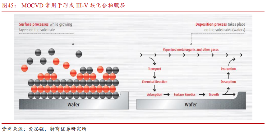 3.1 MOCVD是化合物半导体外延制造核心技术,预计2026年市场达44亿元金属机化学气相沉积(MOCVD)是一种在半导体晶圆上沉积薄膜的工艺,是最重要的制造III-V族化合物半导体的工艺。MOCVD反应原理是III、II族元素的有机化合物和V、VI族元素的氢化物作为沉积源反应原材料,以热分解方式在衬底上形成外延薄层,生长各种III-V族、II-VI族化合物半导体外延层。
