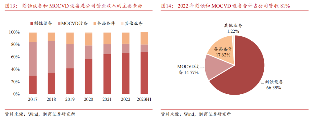 刻蚀设备和 MOCVD设备为公司营业收入主要来源。公司业务以专用设备销售为主,刻蚀设备和 MOCVD设备的销售是公司营业收入的主要来源,2022年刻蚀设备实现营业收入31.5亿元,占比66%,MOCVD设备实现营业收入7亿元,占比15%,两者合计占公司营业收入的81%。
