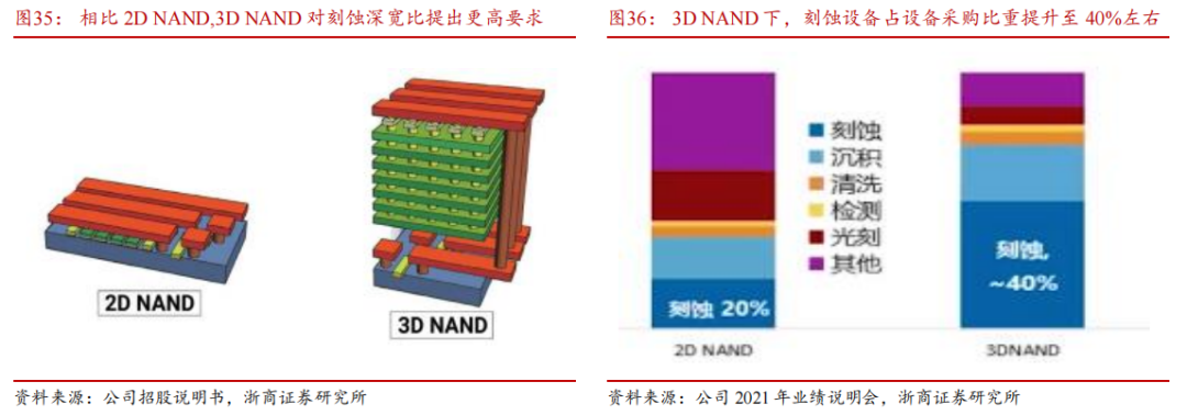 在存储器件领域,3D NAND 堆叠层数增加要求刻蚀技术实现更高的深宽比。集成电路2D存储器件的线宽已接近物理极限,NAND闪存已进入3D时代。3D NAND 制造工艺中,增加集成度的主要方法不再是缩小单层上线宽而是增加堆叠的层数。目前128层 3D NAND 闪存已进入大生产,192 层闪存已处于批量生产阶段,256 层正在开发。刻蚀要在氧化硅和氮化硅的叠层结构上,加工 40:1 到 60:1的极深孔或极深沟槽。3D NAND 层数的增加要求刻蚀技术实现更高的深宽比,为刻蚀设备提出了新的应用方向;同时由于每层均需要经过刻蚀工艺步骤,催生出更多的刻蚀设备需求。