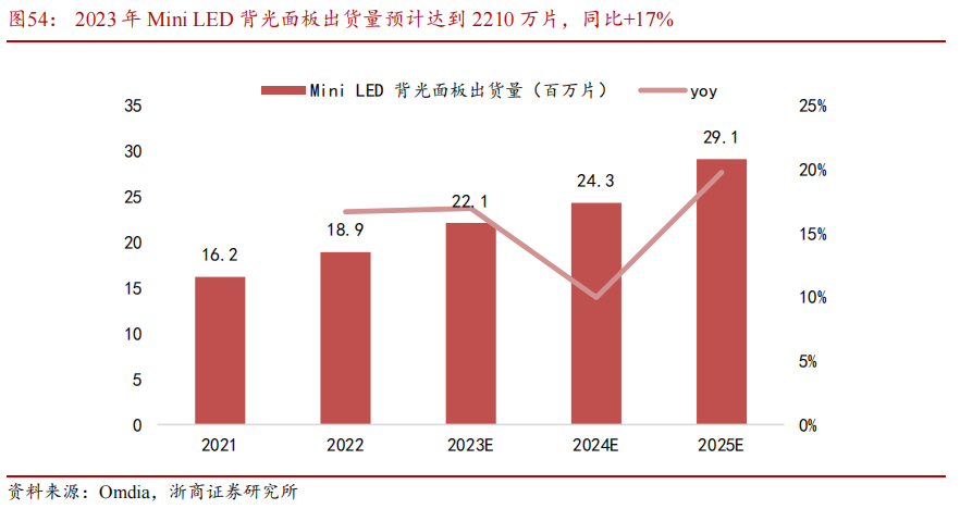 Mini LED背光商业化启动,终端厂商纷纷导入Mini LED背光产品。2021年被称为 Mini LED元年,随着Mini LED技术的逐步成熟、Mini LED芯片价格下降,使得采用Mini LED背光的显示器成本下降,终端厂商纷纷导入Mini LED背光产品。近两年Mini LED热度不断升级,据LED inside统计,截至2023年5月12日,2023年已有42款Mini LED背光产品发布,涉及苹果、三星、TCL等多个品牌,覆盖电视、显示器、笔记本电脑、平板等各种消费及商用电子终端。 LED厂商加大在Mini LED领域的布局,Mini LED新型显示使得LED外延片需求量增长,从而拉动MOCVD设备需求。据LED inside统计,2022年全年约有23个Mini/Micro LED相关项目立项。2022年3月,中国最大的LED外延片和芯片制造商三安光电非公开发行募资79亿元用于湖北三安光电Mini/Micro LED芯片项目获证监会审核通过,2022年12月,该项目定增落地。据Omdia预计,2023年Mini LED背光面板出货量将从2022年的1890万片增长至2210万片。随着 Mini LED在产品端的渗透率提升, Mini LED 新型显示带来的 LED 外延片需求量将快速增长,LED芯片厂商纷纷布局Mini LED领域,MOCVD设备厂商有望受益。