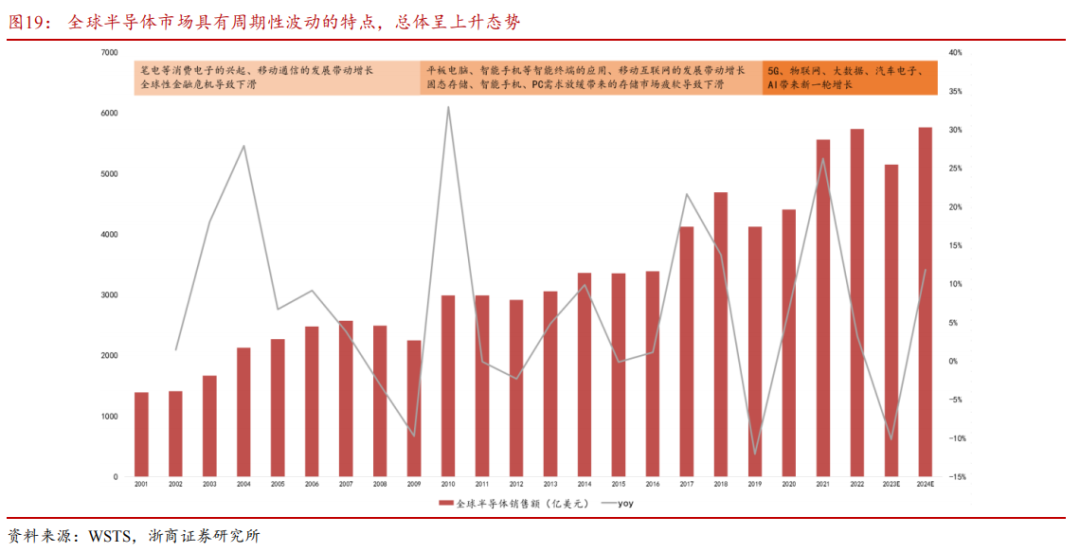全球半导体行业呈现周期性波动,预计2024年有望触底反弹。近年来,5G、物联网、大数据、汽车电子以及AI等新技术和新产品不断发展,经济数字化趋势不断催生新一轮半导体需求。根据SIA发布的统计数据,2022年,全球半导体市场销售额总计5740亿美元,同比增长3.3%,增速较2021年放缓;中国半导体市场销售额为1803亿美元,占全球约31%。2023年半导体行业处于下行状态,预计2024年随着需求复苏有望实现回升并达到新高。