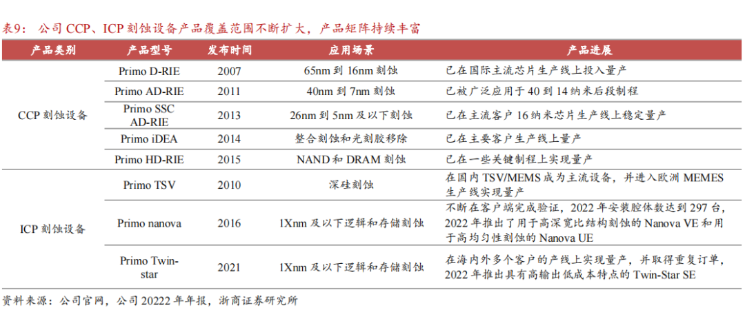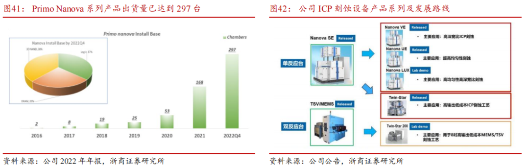 ICP刻蚀设备性能和工艺覆盖度不断增强,产品种类不断丰富。公司ICP刻蚀设备产品以Primo nanova系列为主,截至2022年底,Primo Nanova系列产品出货量已达到 297 台。公司ICP产品种类不断丰富,在原有的单台机ICP 刻蚀设备 Primo nanova家族的 Nanova SE 的基础上,公司先后推出了用于高深宽比结构刻蚀的 Nanova VE 和用于高均匀性刻蚀的 Nanova UE 两种 ICP 设备,在全面满足 55nm、40nm 和 28 nm逻辑芯片制造中的ICP 刻蚀工艺的基础上,拓展了在 DRAM、3D NAND 存储芯片和特色器件等芯片制造中的可刻蚀应用范围。同时,公司在原有的双台机 ICP 刻蚀设备 Primo Twin-Star基础上,推出了 Twin-Star SE 产品:- Nanova VE:用于高深宽比结构刻蚀。配备了双偏压射频发生器和独有的晶圆边缘阻抗动态调节功能,能有效地增加离子的能量,提高刻蚀形貌的垂直度,消除晶圆边缘的倾斜度,并提高刻蚀速度和单位时间的产能。