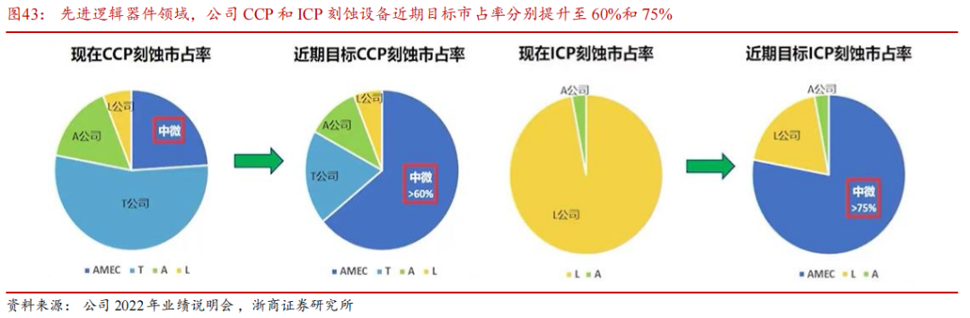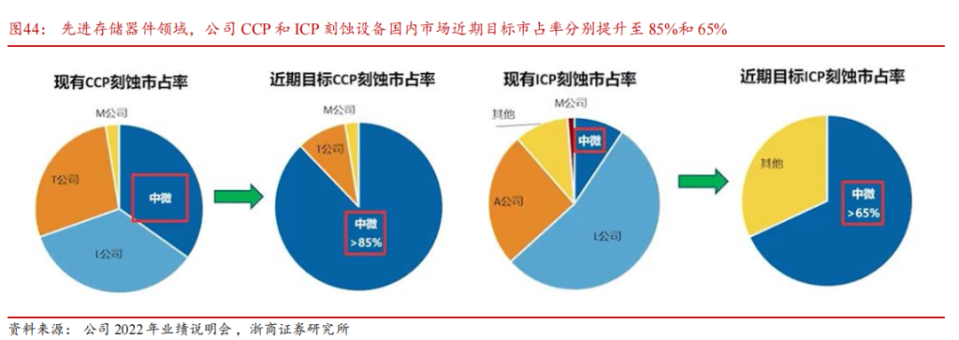 刻蚀设备领军者,目标市占率快速提升。公司部分技术水平和应用领域已达到国际同类产品的标准。在先进逻辑芯片方面,公司已成功取得5纳米及以下逻辑电路产线的重复订单;在存储芯片方面,公司的刻蚀设备在64层及128层3D NAND 的生产线上得到广泛应用。据公司2022年业绩说明会,公司刻蚀设备在国内最先进的逻辑和存储市场的目标市占率大幅提升,预计经过一年时间在国内最先进的逻辑市场和存储市场市占率都将达到60%以上,尤其是在国内先进存储领域,公司预计一年后CCP刻蚀设备市占率将从原来的1/3提升至85%。