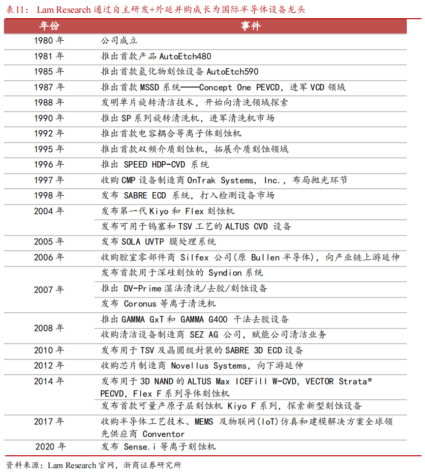 泛林以刻蚀设备起家,通过自主研发和外延并购成长为国际半导体设备龙头。泛林成立于1980年,于1984年在纳斯达克上市。公司深耕于刻蚀设备,同时通过自主研发和外延并购的方式,向沉积设备、清洗机、检测、去胶等领域扩展。公司已形成刻蚀、清洗、沉积三类半导体设备的协同效应,是国际半导体设备龙头。