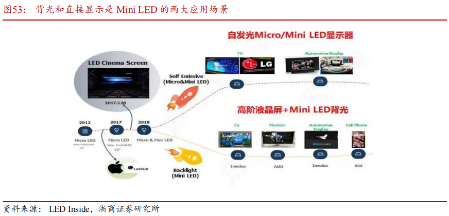 Mini LED可分为背光和直接显示两大应用场景。Mini LED直显是把Mini LED芯片直接作为显示像素点来实现图像显示,是小间距显示屏的升级替代产品,可以提升可靠性和像素密度,主要应用于大尺寸显示如办公室智慧大屏、室外大屏、指挥中心大屏等领域。Mini LED背光是把Mini LED作为LCD面板的背光源,通过在背光模组设置大量芯片来实现画面显示。采用Mini LED背光的LCD,可以大幅提升现有的液晶画面效果,使得超高对比度、超高亮度、超高色域得以实现,同时成本相对比较容易控制,有望成为市场的主流。