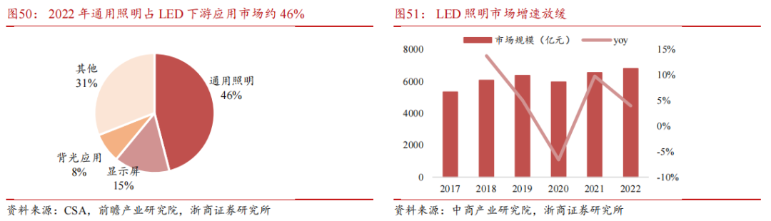 传统LED应用照明市场规模趋于饱和,Mini/ Micro LED等有望带动MOCVD设备市场新一轮增长。照明市场是目前LED行业最大的下游应用市场,2022年,通用照明市场占LED下游应用市场的比重约46%,LED照明市场规模为6813亿元,同比增长4%。近年来,照明行业进入成熟期,市场接近饱和,增速整体比较平缓,与此同时,诸多新兴领域如功率器件,深紫外LED杀菌,特别是用于高端显示的Mini LED和Micro LED的兴起,有利于MOVCD设备市场形成新的发展高潮。