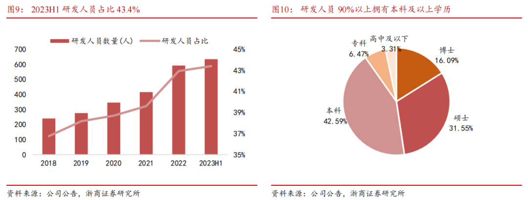 研发人员学历高,占比不断提升。公司研发人员数量不断增加,2023年上半年研发人员数量为634人,占公司员工总数的43.4%。研发人员中有90%以上拥有本科及以上学历,其中有16.09%拥有博士学历,有31.55%拥有硕士学历。