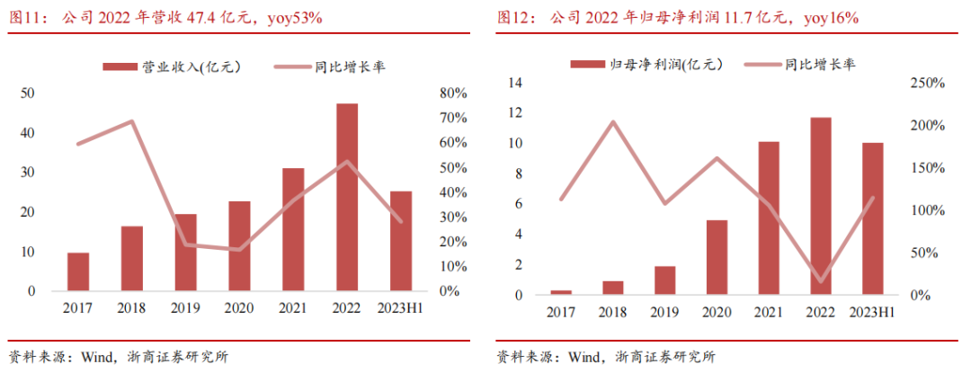 公司营收和净利润增长迅速,过去五年复合增长率分别为37%、108%。公司核心技术不断突破,受益于芯片复杂化及设备国产化,公司与国内外一线客户合作更加紧密,产品的市场占有率稳步提升,营收利润实现高速增长。2022年,公司营业收入大幅增长至47.4 亿元,同比增长 53%,2017-2022年CAGR为37%;实现归母净利润 11.7 亿元,同比增长 16%,2017-2022年CAGR为108%。
