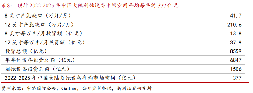 我们预计2022-2025年中国大陆刻蚀设备市场空间平均每年约377亿元。测算假设:1)据公开信息整理,国内8英寸产能缺口约41.7万片/月,12英寸产能缺口约210.6万片/月(详见表3、表4);2)根据中芯绍兴公开资料,中芯绍兴年产51万片(4.25万片/月)8英寸晶圆投资额为58.8亿元,根据中芯国际公告,中芯深圳4万片/月12英寸晶圆投资额为23.5亿美元,折合人民币为151.6亿元(按扩产协议签订年份2021年平均汇率1美元=6.4515人民币进行折算),据此假设8英寸每万片/月投资额为13.8亿元,12英寸每万片/月投资额为37.9亿元。由此测算,中国大陆产能扩张与新建带来的总投资额约8559亿元;3)假设半导体设备占整体投资总额的80%,可得中国大陆产能新建与扩张带来的半导体设备投资总额约6847亿元;4)据 Gartner 统计,2022年全球刻蚀设备占晶圆制造设备价值量约22%,则中国大陆刻蚀设备投资总额约1506亿元。假设现有产能规划下的刻蚀设备需求将在2025年之前逐步释放,我们预计2022-2025年中国大陆刻蚀设备市场空间平均每年约377亿元。