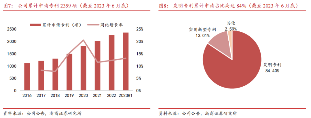 公司拥有多项知识产权和发明专利,自主创新水平高。公司高度重视核心技术的创新,在刻蚀设备和 MOCVD 等设备的开发、设计和制造过程中始终强调创新和差异化。截至2023年6月底,公司已申请 2,359 项专利,其中发明专利 1991 项,占比84%;已获授权专利1425 项,其中发明专利1202项,占比84%。公司技术储备深厚、研发实力强,为产品和服务不断进步提供保证。
