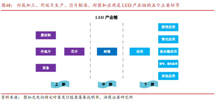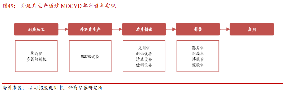 LED产业链中的外延片生产环节通过MOCVD单种设备实现,MOCVD设备是LED制造中最重要的设备。LED产业链中主要涉及的设备包括用于衬底加工的单晶炉、多线切割机;用于外延片制造的 MOCVD 设备;制造芯片所需要的光刻、刻蚀、清洗、检测设备和封装所需要的贴片机、固晶机、焊线台和灌胶机等。外延片生产是 LED产业链上的重要环节,其制备主要通过 MOCVD 单种设备实现,目前外延片生产的主流技术是金属有机化学气相淀积法。据公司招股说明书,MOCVD 设备采购金额一般占 LED 生产线设备总投入的50%以上,是LED产业链所涉及的设备中价值占比最高的设备。