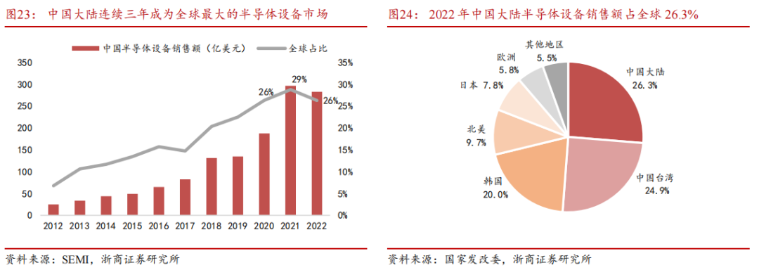 中国大陆半导体设备市场发展迅速,已连续三年成为全球最大的半导体设备市场。据SEMI统计,中国大陆2022年半导体设备销售额为283亿美元,全球占比达到26%,2020-2022年已连续三年成为全球最大的半导体设备市场。中国大陆半导体设备市场发展迅速,2012-2022年实现CAGR 27%。