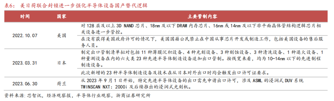 美日荷对华先进制程封锁,设备国产替代逻辑进一步加强。2022年10月7日,美国进一步收紧对中国半导体产业的出口管制,对18纳米及以下DRAM、128层及以上NAND闪存、16纳米或14纳米及以下逻辑芯片设备出口进行管控。2023年3月,荷兰、日本相继加入美国对华芯片出口管制阵营。2023年6月30日,荷兰政府颁布半导体设备管制新规,规定从2023年9月1日开始特定先进半导体设备的出口需先申请出口许可,涉及ASML的2000i及后续推出的浸润式光刻机。美日荷管制趋紧大环境下,国产设备厂商为实现设备自主可控不断努力,国内晶圆厂对国产设备验证意愿也不断增强,国际限制因素使得设备国产化逻辑进一步增强。