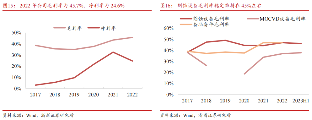 销售毛利率近三年不断提高,刻蚀设备毛利率维持在较高水平。近年来公司毛利率不断提升,由2019年的34.9%提升至2022年的45.7%。2020年以来,刻蚀设备毛利率稳定在45%左右,2022年提升至47%;MOCVD设备毛利率不断提升,由2020年的18.65%上升至2022年的37.01%,主要由于公司应用于Mini LED的新产品Prismo UniMax性能良好,客户接受程度高,带动MOCVD设备毛利率显著增加。2022年净利率下降,主要系计入非经常性损益的政府补助收益和因股权投资产生的公允价值变动收益和处置收益较上年同期减少所致。