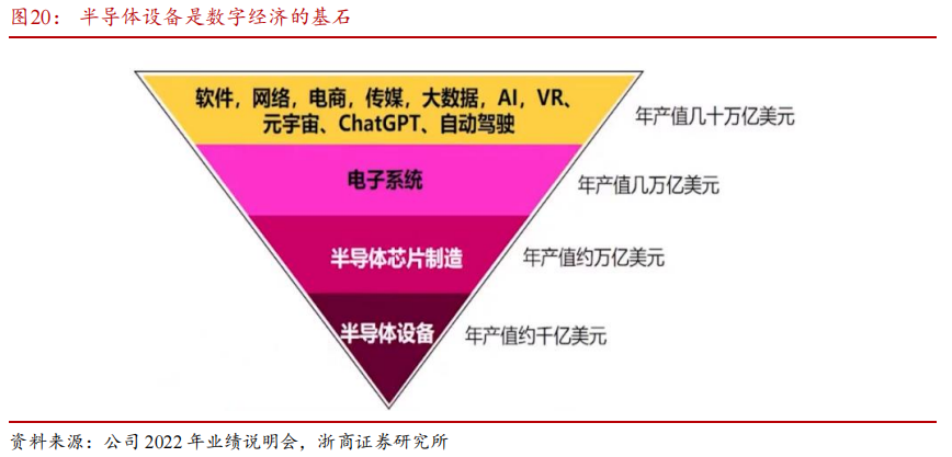 半导体设备是半导体行业的基石。半导体设备行业属于整个半导体产业链的上游,是上游核心环节之一。一般情况下半导体产品制造要超前电子系统开发新一代工艺,半导体设备要超前半导体产品制造开发新一代产品,也即“一代设备,一代工艺,一代产品”。
