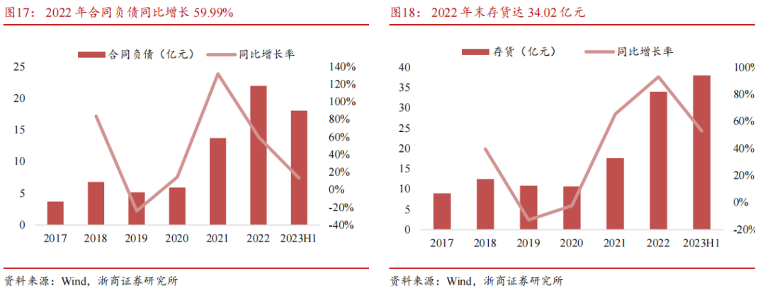 合同负债及存货大幅增长,订单充裕保障未来业绩。2022年,公司合同负债为22亿元,同比增长60%;存货达34亿元,同比增长93%,公司大量备货以及时满足下游客户需求。公司在手订单充裕,2022年新签订单金额达 63.2 亿元,同比增长53%,新签订单大幅增长,为公司未来业绩高增长注入动力。